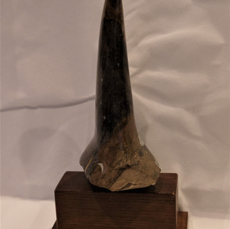 20cm high on a wooden stand, this curious rock spike has just been identified by the Natural History Museum. You might be disappointed that it is not a fossilised auroch horn or the fang of some truly spectacular dinosaur BUT it is far too old to have anything to do with dinosaurs. Imagine a piece of rock, probably from North Africa, that is 400 or so million years old, containing fossilised nautiloid (orthoceras) traces from the Ordovician or Silurian periods at the latter end of the Paleozoic era. The rock has obviously been cut and polished to achieve its pleasing shape as an eyecatching and decorative piece but just imagine all that history if you can - that is what we find irresistible about objects like this. The fossil traces are actually from the breathing tubes that ran through the nautiloid shells as shown in the additional NHM photographs.