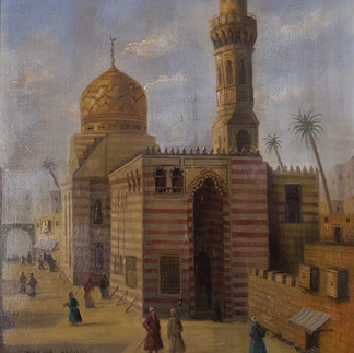 Arab street scene with figures before a minaret (possibly the artist's impression of the Sinan Pasha mosque in Damascus) in a highly decorative modern gilt ribbon crested frame. Image 68 x 50cm. From the collection of a London based Middle Eastern family, this is a serious painting.