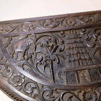 This splendid presentation box is beautifully carved with an image of a South Indian temple flanked by elephants with inset mother of pearl eyes and must once have been a very grand gift indeed. We have a theory that the 'coins' making up the finials of the spoons are replicas of local coins, possibly silver 'taras', the smallest silver coins from the ancient kingdom of Vijayanagara where the temple looks exactly like the one depicted. That may be fanciful, they may be copies of coins from Travancore or another of the princely state that survived until much more recently, temples like and there are other South Indian temples with tall towers, gopurams, like this one are easy enough to find. Either way, this is a highly unusual present, a real curiosity and yet with a perfectly good practical purpose.