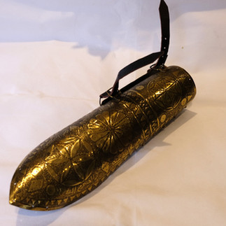 A North Indian brass armguard or Dastana, probably from Rajasthan, decorated with roundels and script, date uncertain, probably 19th century. We think this armguard should now be worn as the most spectacular ornament, more so even than a jewelled Chinese nailguard. It has travelled back to India for some repairs and quite astonishingly exactly the same brass springs as the originals are still to be found in the Jaipur market. A very unusual present indeed – a bangle on steroids. £260